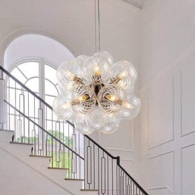 Sidabrinis pakabinamas šviestuvas su skaidriais kristalais ir gaubtu -